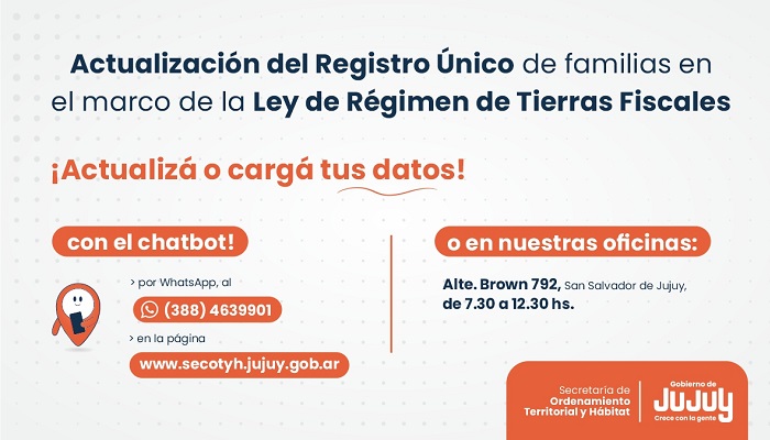 El equipo de la Secretaría de Ordenamiento Territorial y Vivienda (SECTOyH), recuerda a las familias que se encuentran habitando lotes fiscales de manera irregular y/o que se enmarcan en la ley de Régimen de Tierras Fiscales, que pueden actualizar sus datos en el Registro Único.